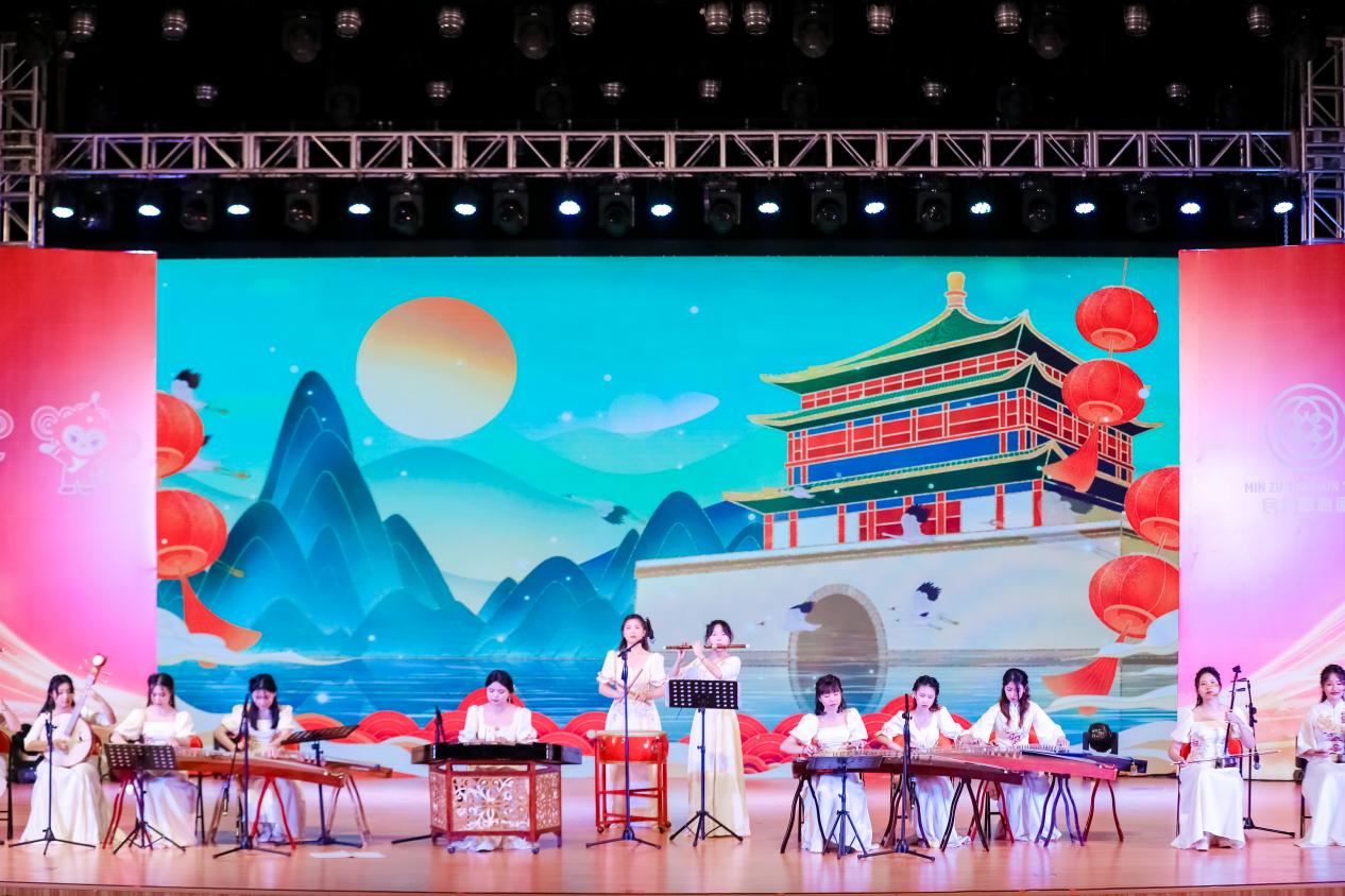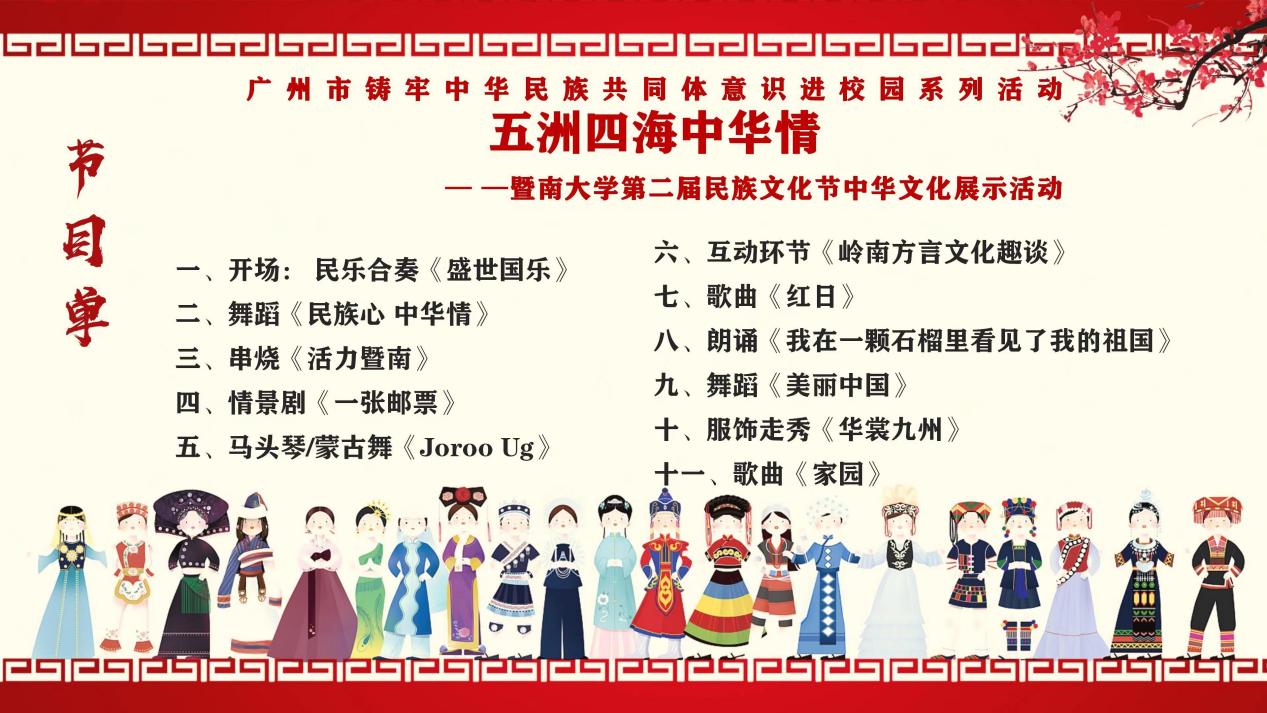 晚会在一曲气势宏伟的民乐合奏《盛世中华》拉开帷幕。学生艺术团舞蹈团的民族舞串烧《民族心 中华情》将各民族文化融入到翩跹的曼舞之中,诠释了浓郁的民族风情。扯铃协会和国标舞协会的《活力暨南》,把东方传统的民俗技艺与西方的激情浪漫完美结合,体现了中华文明正是在与世界文明的交流互鉴中不断焕发新的活力。情景剧《一张邮票》通过现场演绎与现代科技契合,带领观众走入了侗族、白族、彝族、黎族等地区,好客的姑娘翩翩起舞,热情的小伙子唱着敬酒歌,迎接远道而来的客人,将绚丽多姿的民族风情呈现在眼前。蒙古族文化展示《Joroo Ug》以呼麦、马头琴、蒙古舞的形式展示草原儿女的豪情与欢乐。