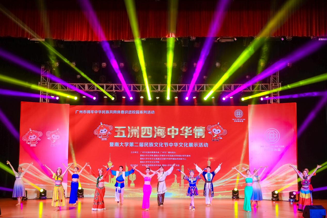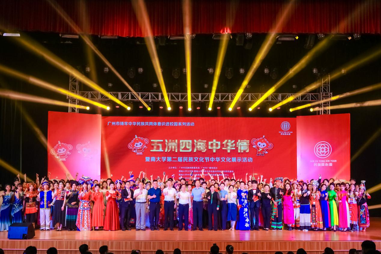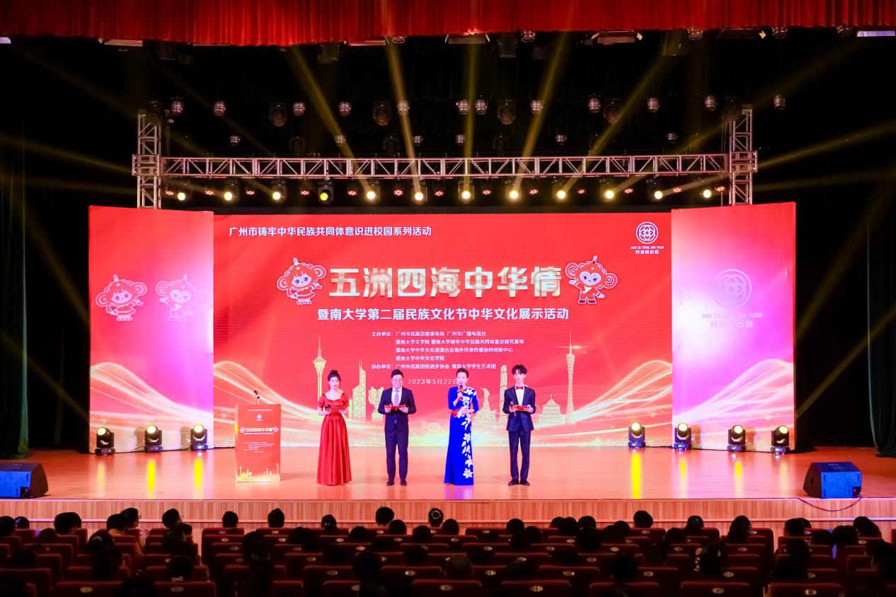 2023年5月22日晚,暨南大学第二届民族文化节在石牌校区大礼堂成功举办。民族文化节以“五洲四海中华情”为主题,以聚集各民族文化资源、创新表演形式、体现校园铸牢中华民族共同体意识为亮点,把铸牢中华民族共同体意识贯彻活动始终,打造了纵延古今、横联函夏的视听盛宴。学校党委常委、统战部部长庄汉文,广州市民族宗教局一级调研员(市管干部)商伟,学校机关各部处、学院等单位的领导出席了此次活动。