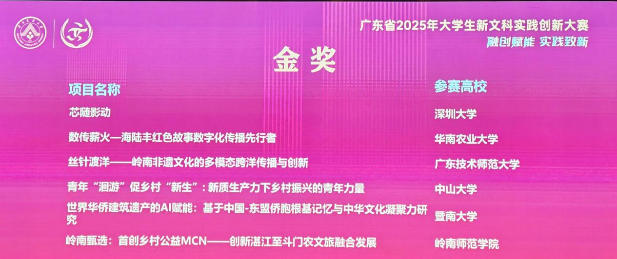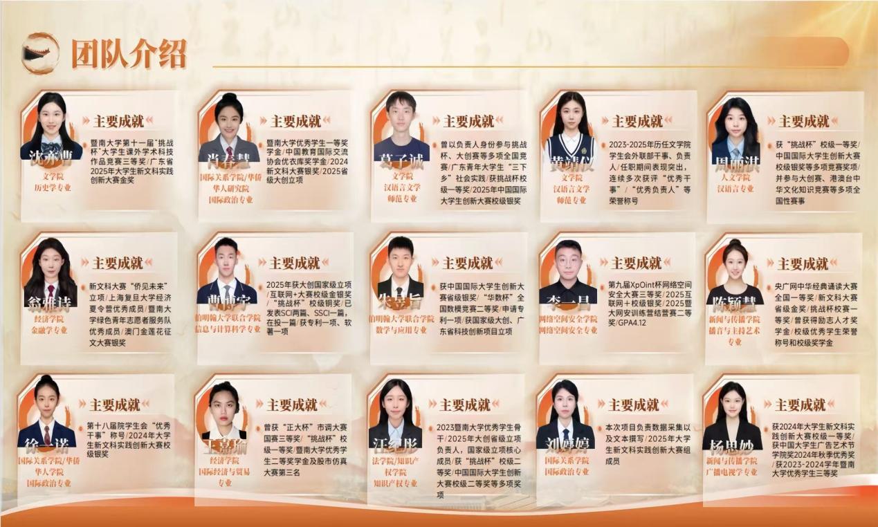 此次荣获省级金奖,不仅是对“侨见未来”团队创新能力和学术水准的充分肯定,也是对我校推动新文科建设、促进跨学科协同创新人才培养模式的有力印证。它生动展现了暨南大学在科技赋能人文、推动中华文化在港澳台及海外传承传播方面的积极探索与成效。