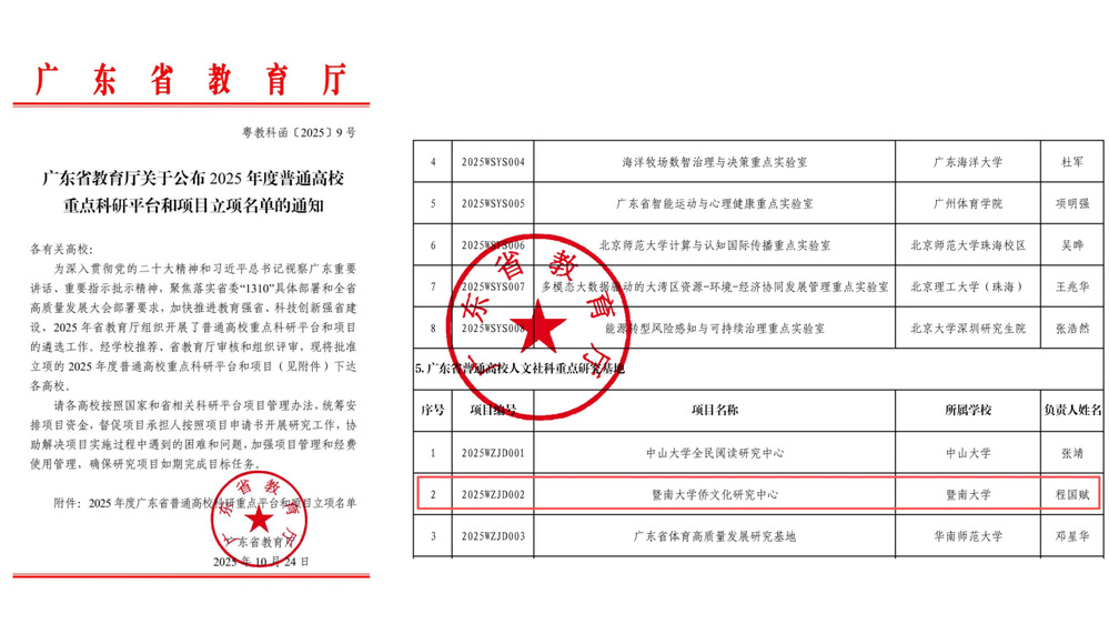 近日,广东省教育厅公布了2025年度普通高校重点科研平台和项目立项名单,由中华文化港澳台及海外传承传播协同创新中心主任程国赋教授牵头的“暨南大学侨文化研究中心”获批为广东省普通高校人文社科重点研究基地,暨南大学侨文化研究院的建设发展取得新突破。